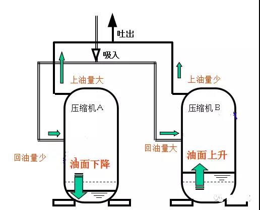 1.1、保持油面壓縮機(jī)并聯(lián)使用時(shí),由于壓縮機(jī)的上油量和系統(tǒng)回油量的的差異,長久運(yùn)轉(zhuǎn)會(huì)引起壓縮機(jī)的油面發(fā)生變化(一方油面降低,一方油面上升)。如下圖: